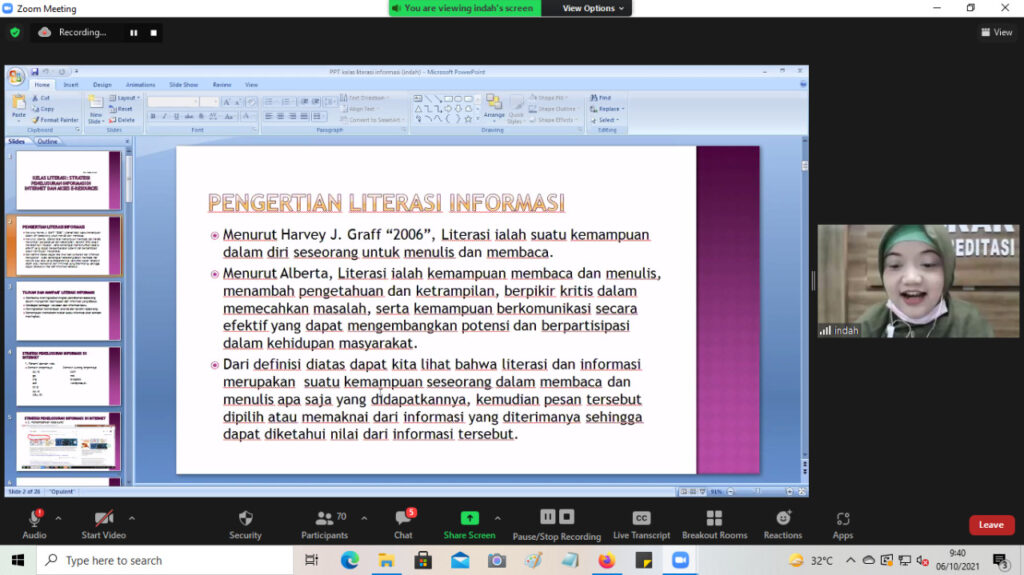 Semarang, 6 Oktober 2021 UPT Perpustakaan menyelenggarakan Kelas Literasi Informasi : Strategi Akses E-Resorces dan Aplikasi Mendeley sebagai penutup serangkaian kegiatan Library Festival 2021. Kegiatan dibuka oleh Kepala Perpustakaan UNIMUS dan diikuti oleh puluhan peserta Mahasiswa di lingkungan civitas akademika Universitas Muhammadiyah Semarang. Dalam sambutannya Kepala Perpustakaan menyampaikan literasi informasi merupakan kunci pembelajaran, yakni bagaimana seseorang mampu mengidentifikasi kebutuhan informasi, melakukan pemetaan informasi, menelusur informasi, mengevaluasi dan menggunakannya secara beretika. Perkembangan lingkungan informasi dan teknologi yang berkembang pesat menjadikan literasi informasi semakin penting dalam pendidikan. Mahasiswa yang literate lebih mampu menghadapi lingkungan informasi yang kompleks dan menekan terjadinya information anxiety. Pentingnya literasi informasi mendorong berbagai perguruan tinggi mengeluarkan kebijakan khusus. Kebijakan secara nyata diimplementasikan oleh perpustakaan dengan mengadakan berbagai kegiatan yang mendorong peningkatan kemampuan literasi informasi, termasuk pelatihan literasi informasi oleh pustakawan.