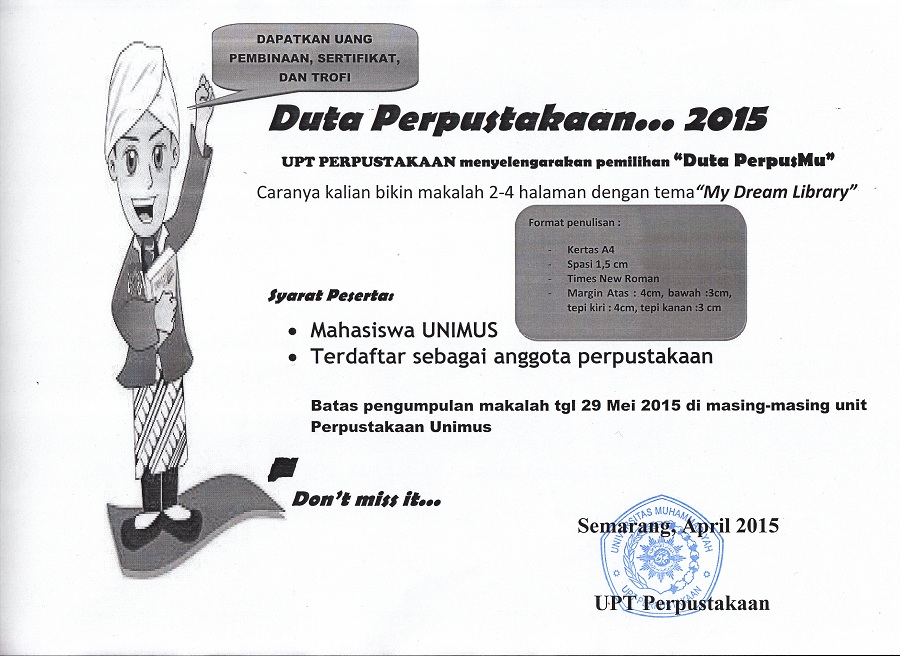 Semarang | Pemilihan duta perpustakaan untuk mahasiswa Universitas Muhammadiyah Semarang. Untuk medaftarkan diri sebagai duta perpustakaan mahasiswa harus membuat makalah 2 – 4 halaman dengan tema “My Dream Library“, berikut poster persyaratannya: