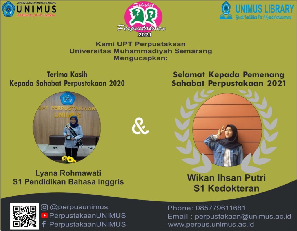 Selamat Kepada Wikan Ihsani Putri (mahasiswa S1 Kedokteran UNIMUS) atas terpilihnya sebagai Sahabat Perpustakaan 2021 dan terimakasih kepada Sahabat Perpustakaan 2021 Lyana Rohmawati (S1 Pendidikan Bahasa Inggris UNIMUS) atas partisipasi dan dedikasinya selama ini telah berkontribusi terhadapa kemajuan Perpustakaan UNIMUS