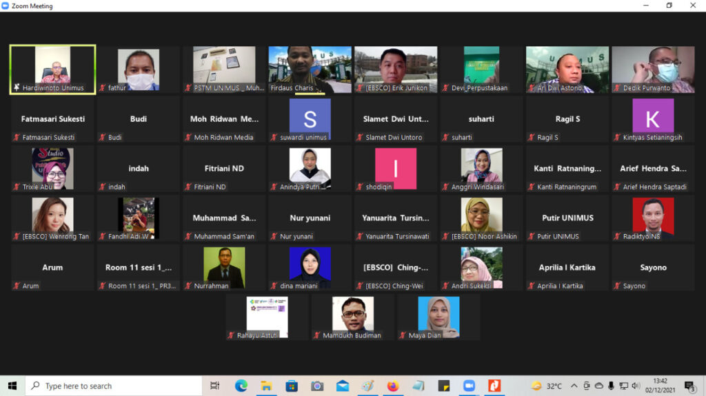 Kamis, 2 Desember 2021 UPT Perpustakaan menyelenggarakan Sosialisasi Pemanfaatan E-Journal EBSCO Academic Search Elite secara daring diikuti oleh seluruh Program Studi di Lingkungan Universitas Muhammadiyah Semarang. Acara dibuka oleh Wakil Rektor II Universitas Muhammadiyah Semarang Dr. Hardiwinoto, M.Si dan dimoderatori oleh Kepala UPT Perpustakaan M. Firdaus Charis Nursecha, S.Hum. Selaku narasumber. Digelar secara daring, agenda sosialisasi pemanfaatan e-journal EBSCO tersebut menghadirkan narasumber Erik Junikon, S.Kom (Regional Sales Manager, EBSCO International). Universitas Muhammadiyah Semarang kini telah aktif berlanggan database E-Journal EBSCO Academic Search Elite yang dimanfaatkan oleh seluruh civitas akademika Universitas Muhammadiyah Semarang. Database tersebut digunakan sebagai bentuk fasilitas penyediaan referensi ilmiah dalam bentuk e-journal bagi sivitas akademika UNIMUS. Hal itu dilakukan dalam upaya peningkatan mutu dalam berkala ilmiah/jurnal, buku teks, dan buku ajar di UNIMUS, pengembangan teknologi tepat guna, serta penemuan baru ilmu pengetahuan yang dihasilkan peneliti dan dosen di UNIMUS.