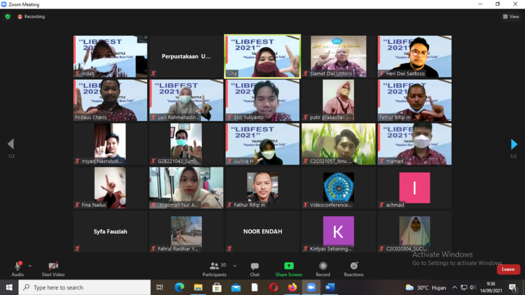 Semarang, 14 September 2021 bertepatan dengan peringatan hari kunjung Perpustakaan, UPT Perpustakaan menyelenggarakan Talkshow Battle : Passion dan Literasi dan Baca Tulis sebagai agenda pembuka pada serangkaian kegiatan Library Festival (Libfest) 2021. Libfest tahun ini dibuka langsung oleh Kepala UPT Perpustakaan Universitas Muhammadiyah Semarang. Hadir sebagai narasumber adalah beliau Eko Yuliyanto, S.Pd., M.Pd dan Heri Dwi Santoso, M.Hum. Talkshow kali ini dimoderatori oleh Kepala UPT Perpustakaan UNIMUS beliau M FIrdaus Charis Nursecha, S.SHum. Diakhir acara diadakan game battle kepada kedua narasumber melalui review buku yang kemudian dipolling oleh peserta. Muncul sebagai pemenang adalah Bapak Heri Dwi Santoso, M.Hum. Harapan dari kegiatan ini adalah untuk meningkatkan gerakan literasi khususnya literasi baca dan tulis dengan mengkaji sisi passion pada masing-masing individu.